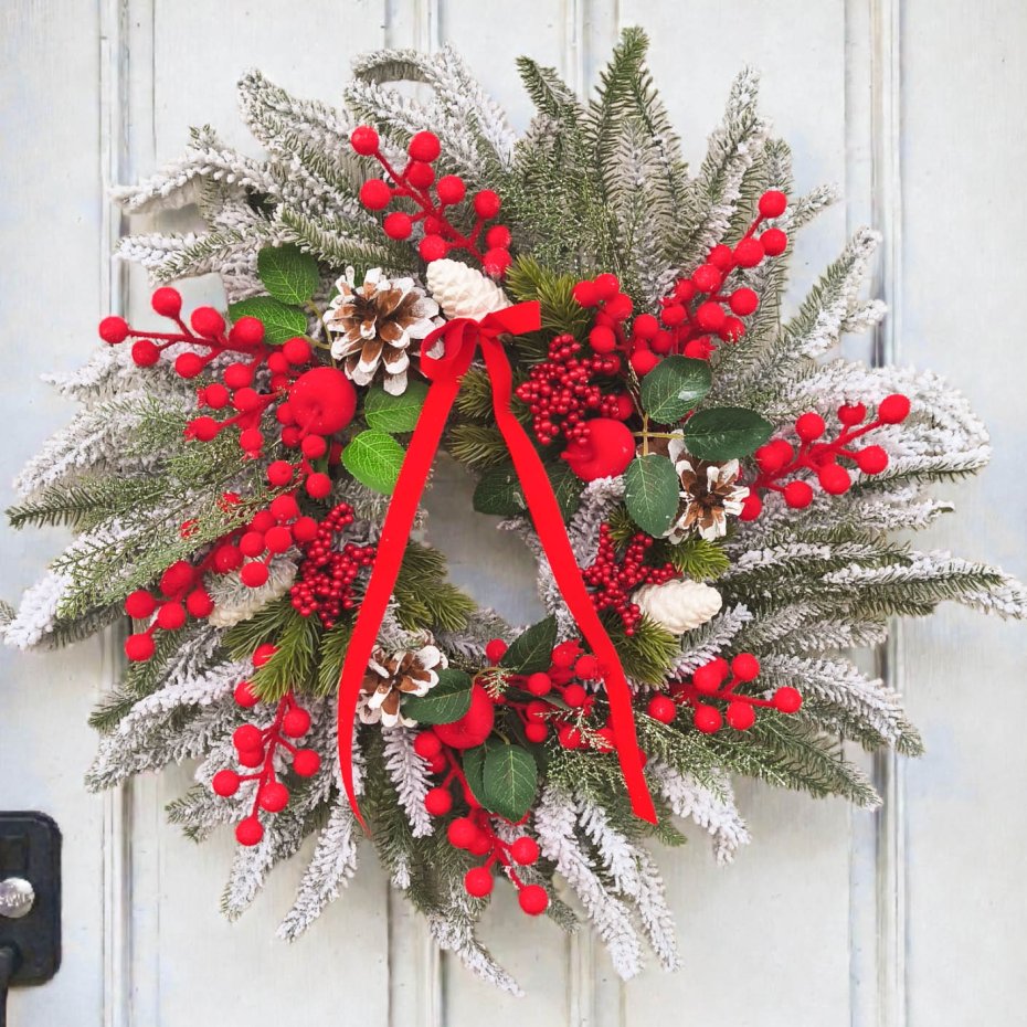 Wyjątkowy wianek świąteczny w zimowej stylistyce.Połączenie oszronionych sztucznych gałązek, czerwonych dodatków oraz naturalnych szyszek tworzy kompozycję pełną świątecznego uroku. Idealny na drzwi lub jako świąteczna dekoracja wnętrza. Wianek o średnicy ok. 55cm