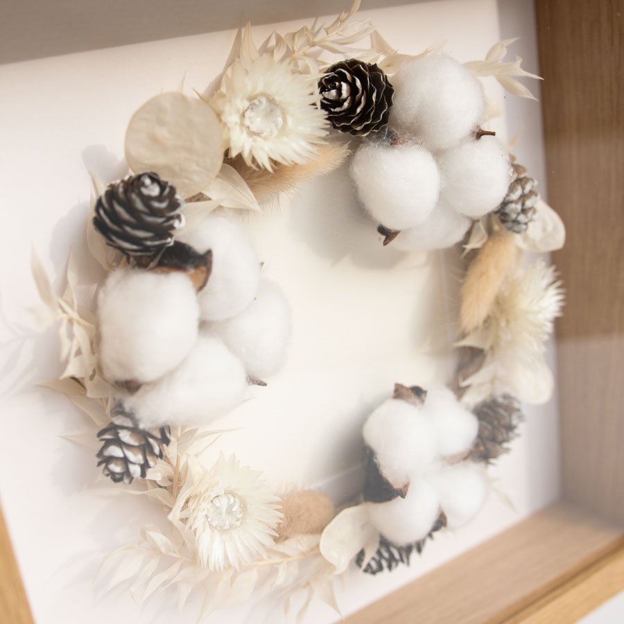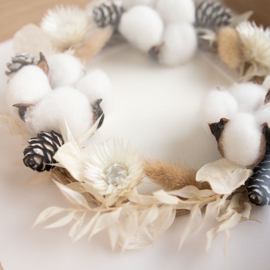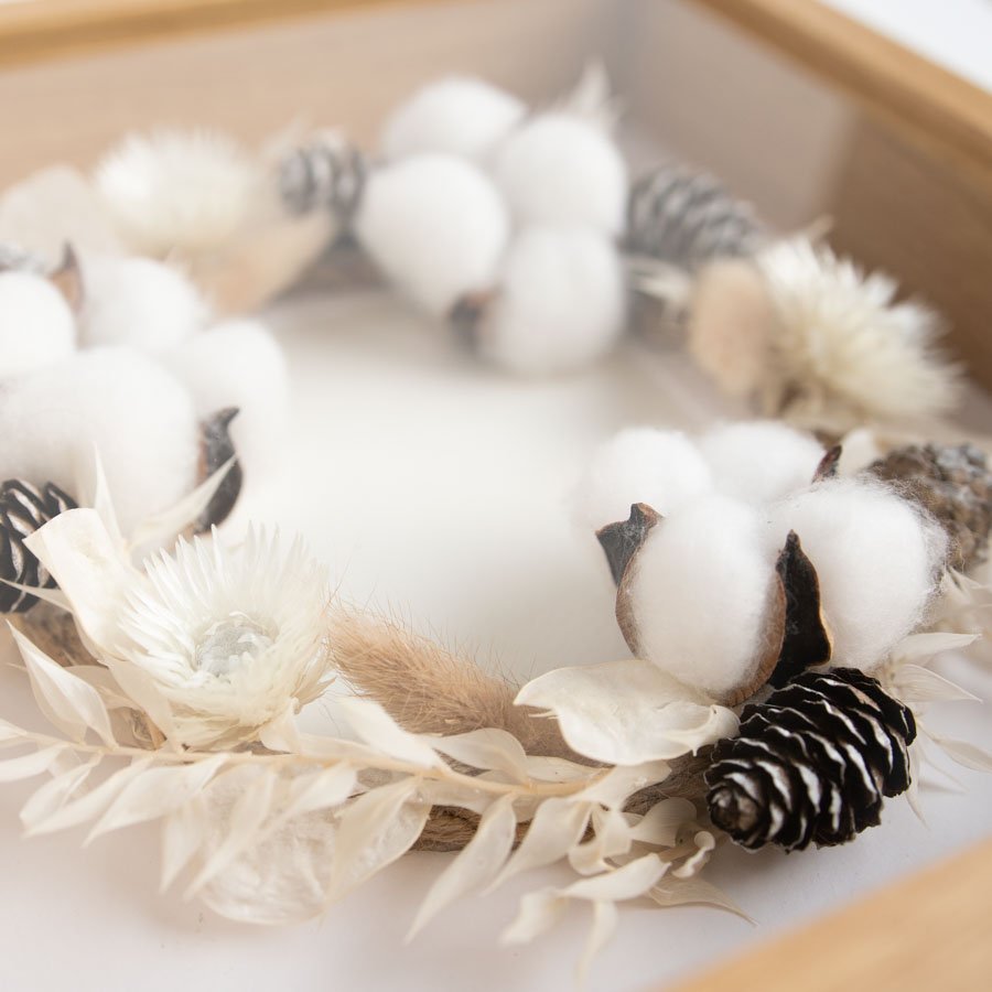 Wianek ukryty w środku jest wykonany z suszonych i stabilizowanych roślin, naturalnych szyszek i główek bawełny.