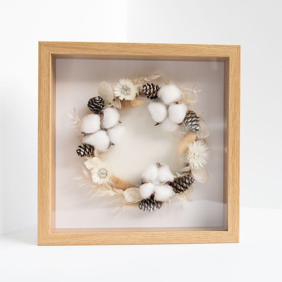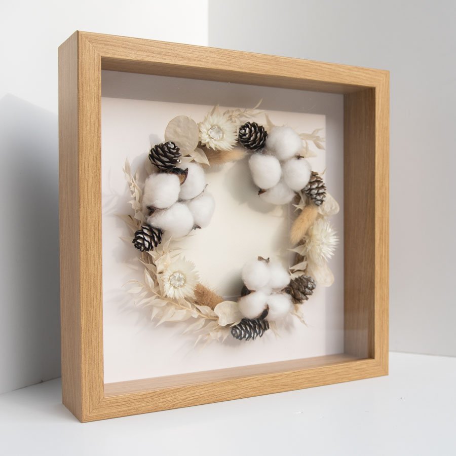 Nietypowa dekoracja świąteczna - wianuszek zamknięty w ramce 3d. Dzięki zamknięciu dekoracji za szybką wianek nie brudzi się i nie kurzy, będzie piękną ozdobą na wiele sezonów! Ramkę można powiesić na ścianie lub postawić na komodzie czy kominku.