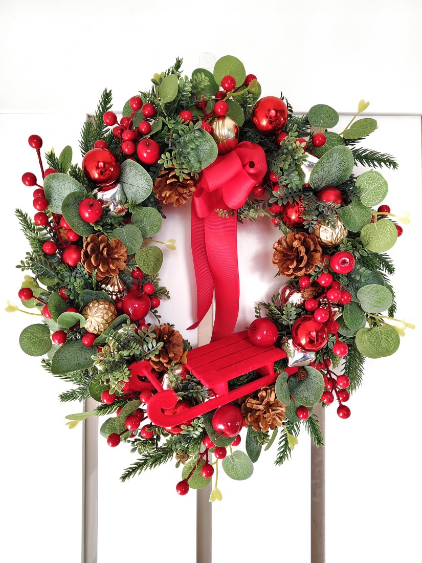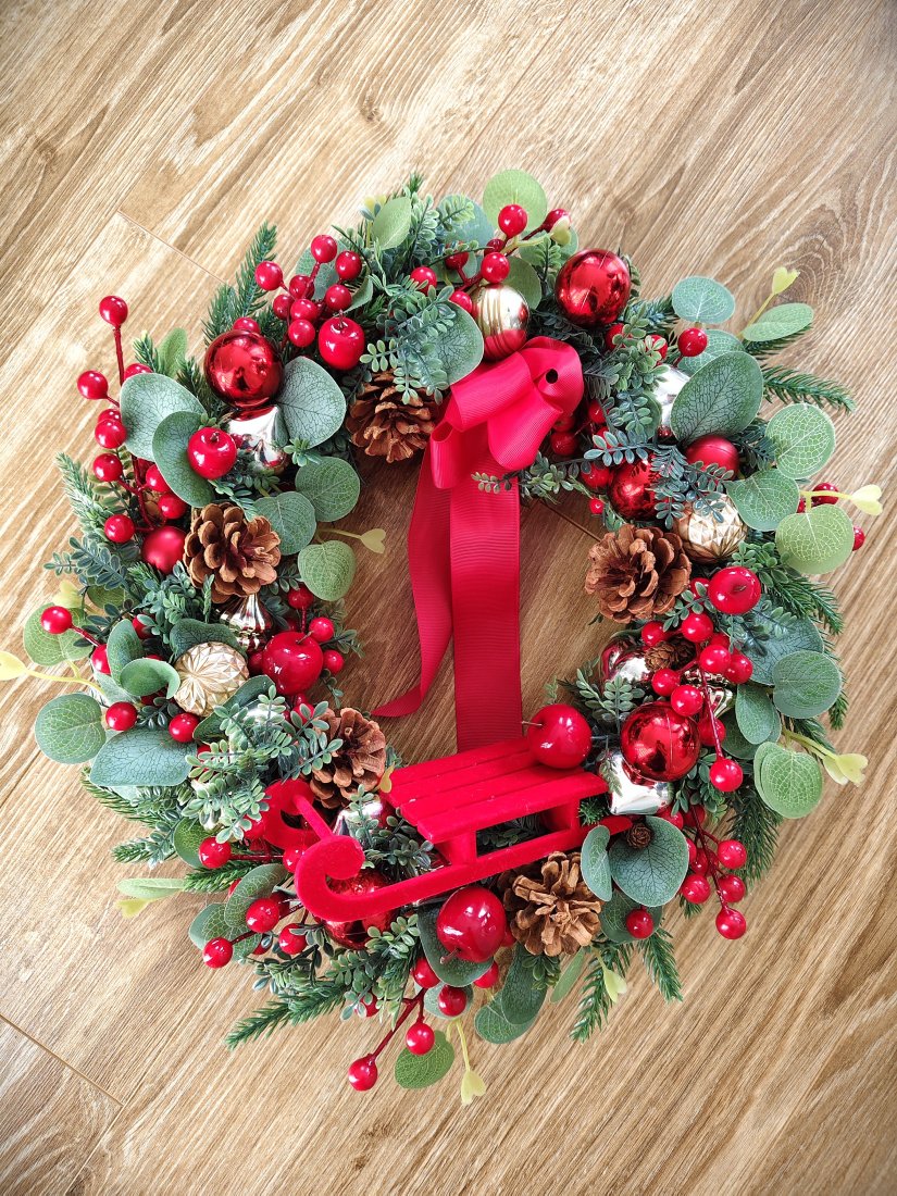 Świąteczny sztuczny wianek został wykonany z gałązek wysokiej jakości. W roli głównej urocze czerwone sanki) Ozdobiony szyszkami, owocami glogu, jabłuszkami i bombkami w odcieniach czerwieni, srebra i złota.