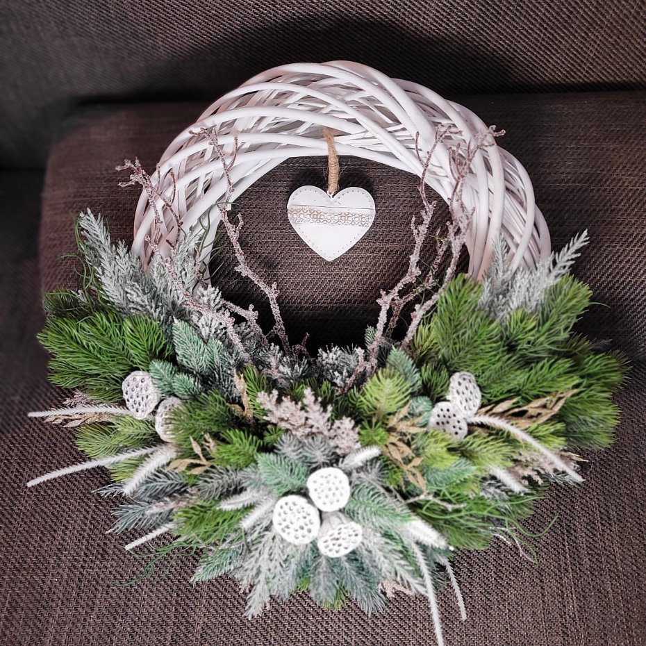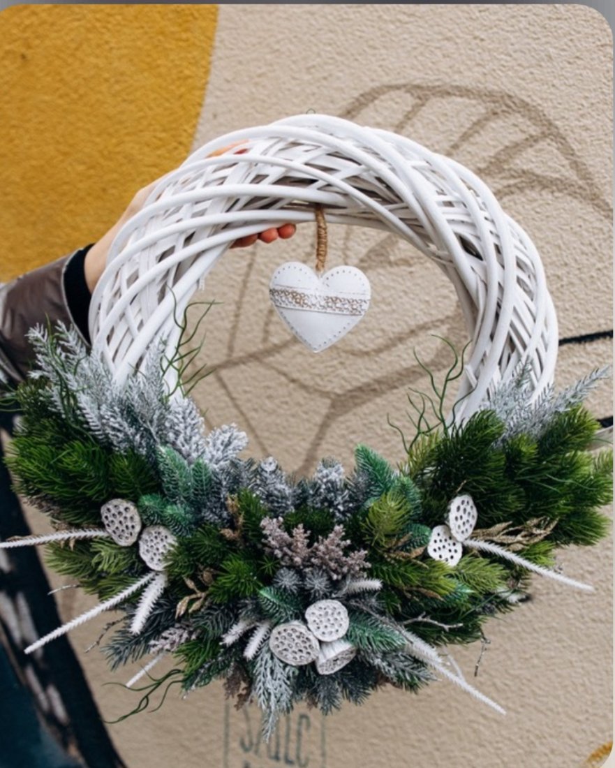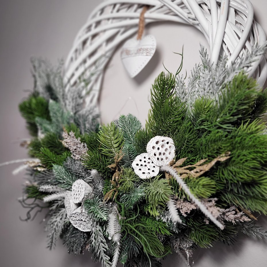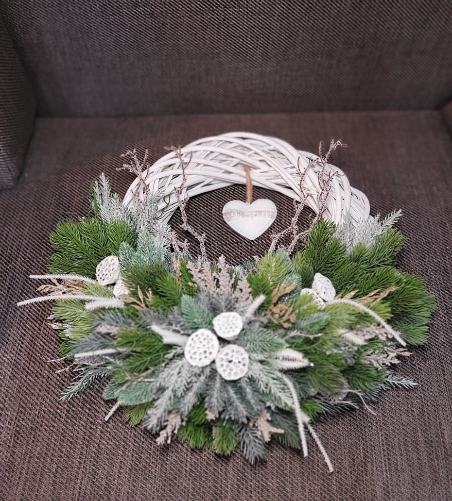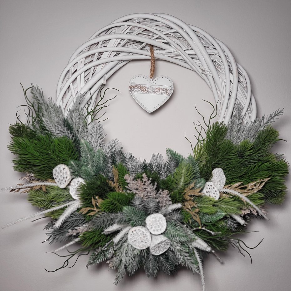 Wykonany ręcznie z dbałością o każdy detal: biała, pleciona podstawa, gęsta zieleń iglasta oraz delikatne zimowe dekoracje sprawiają, że staje się stylowym akcentem każdego wnętrza.