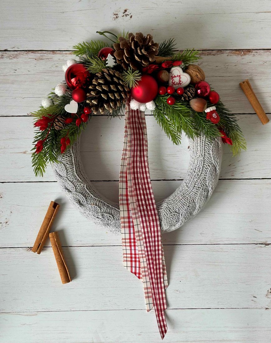Wykonany z wielką dbałością o szczegóły wianek w szarym sweterku. Zimowa dekoracja świąteczna z ozdobami ze sztucznego igliwia i dodatków (szklane bombki, naturalne i syntetyczne ozdoby).