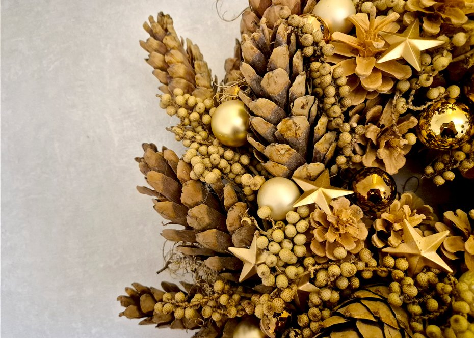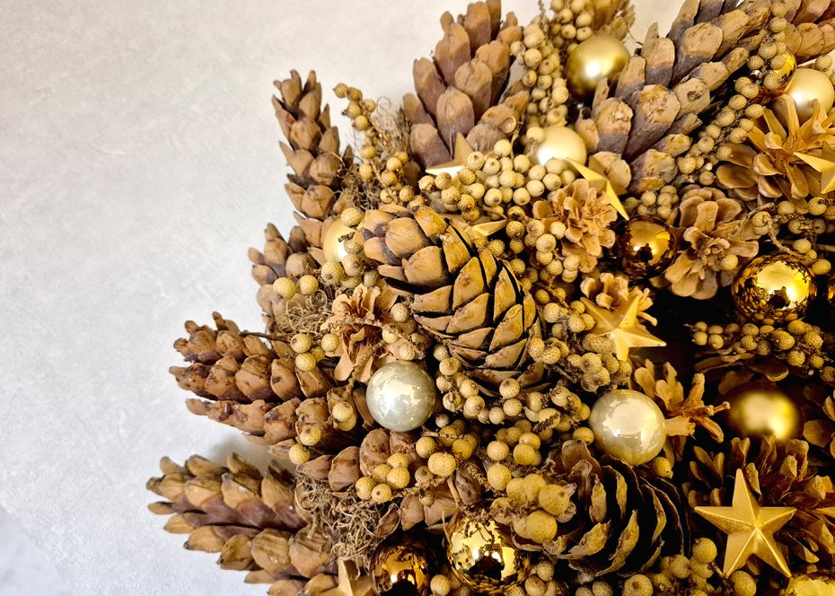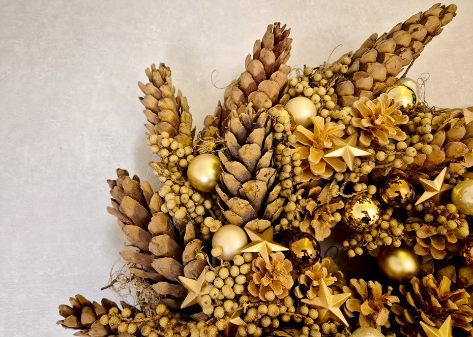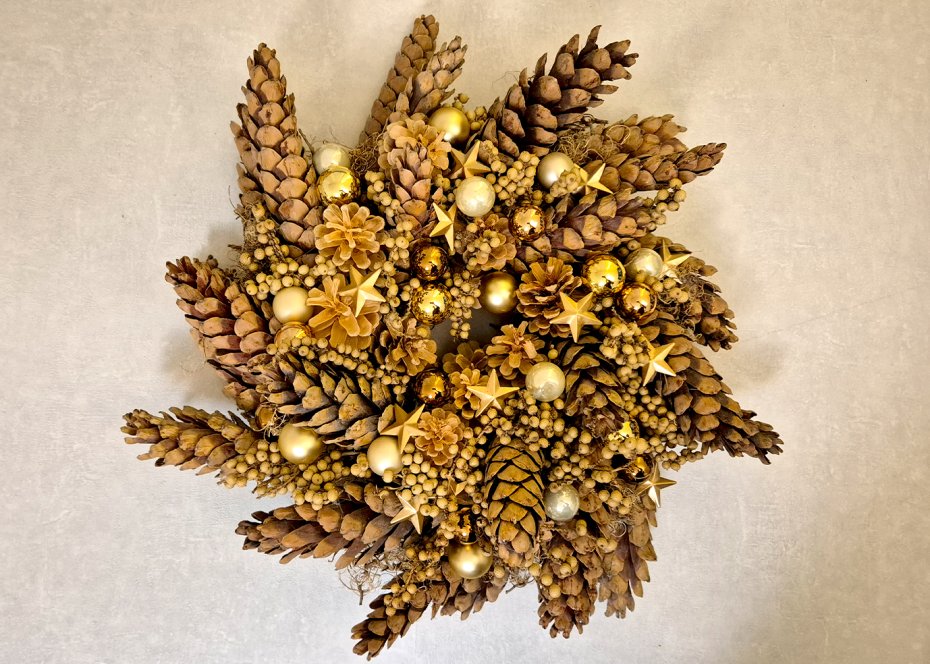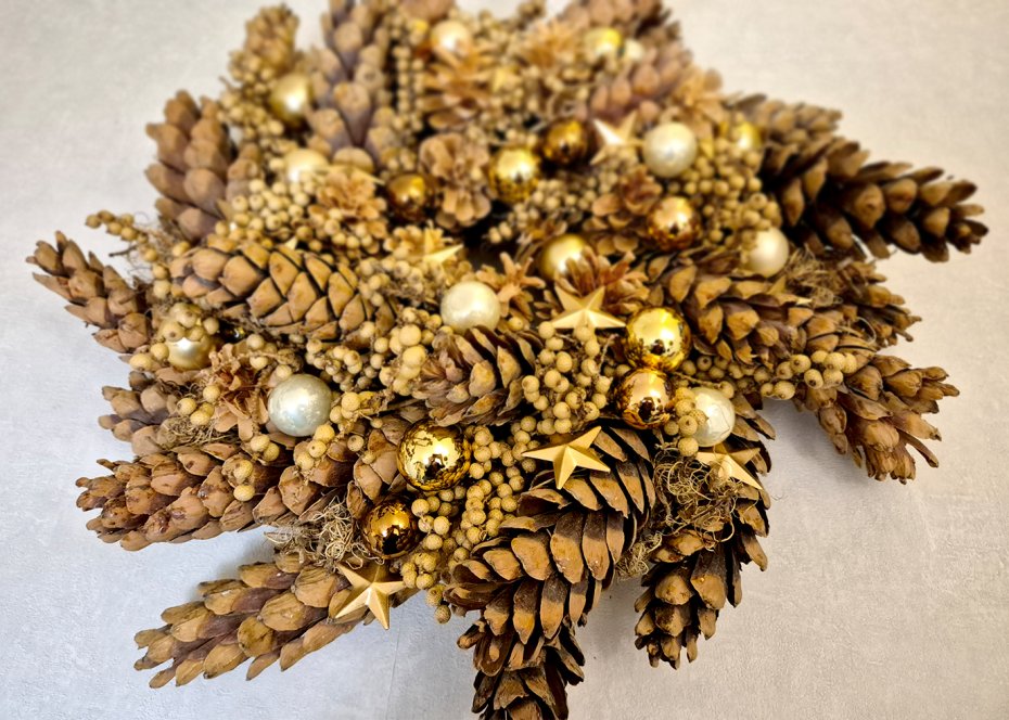 Złoty i nieskromny;) Prawdziwy nadszyszkownik Twojej Szuflandii W całości wykonany z suszu, szyszek różnych gatunków, owoców palmy.