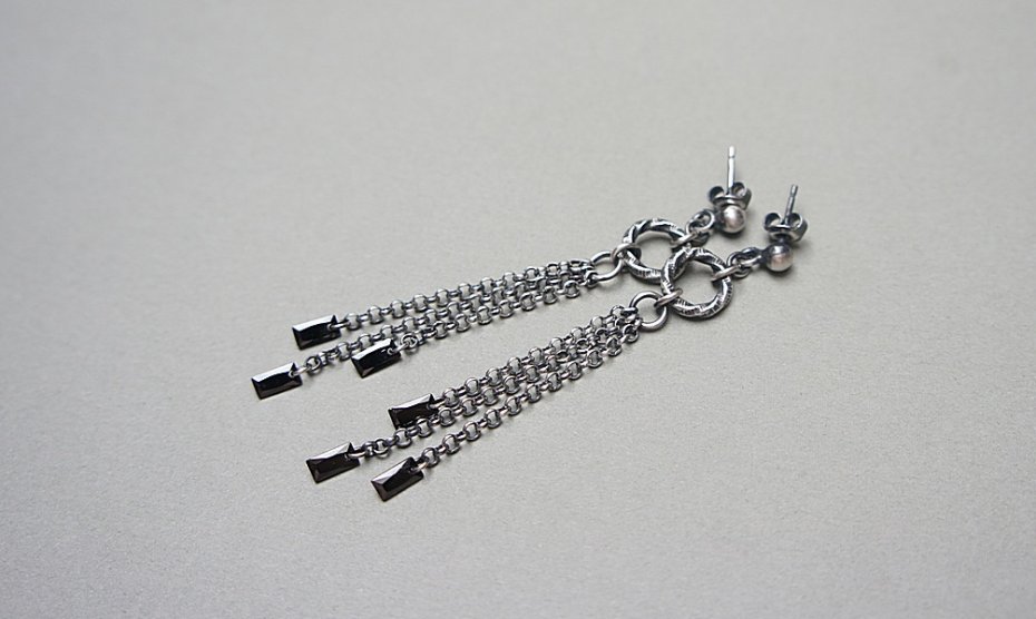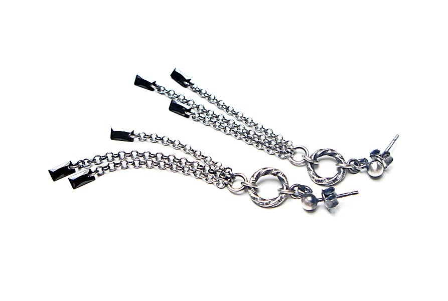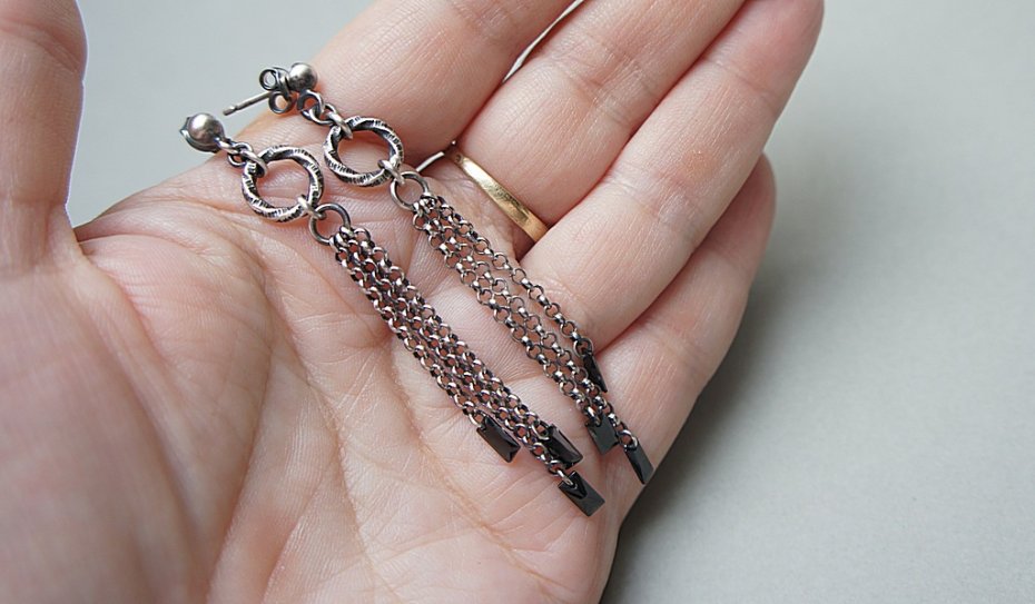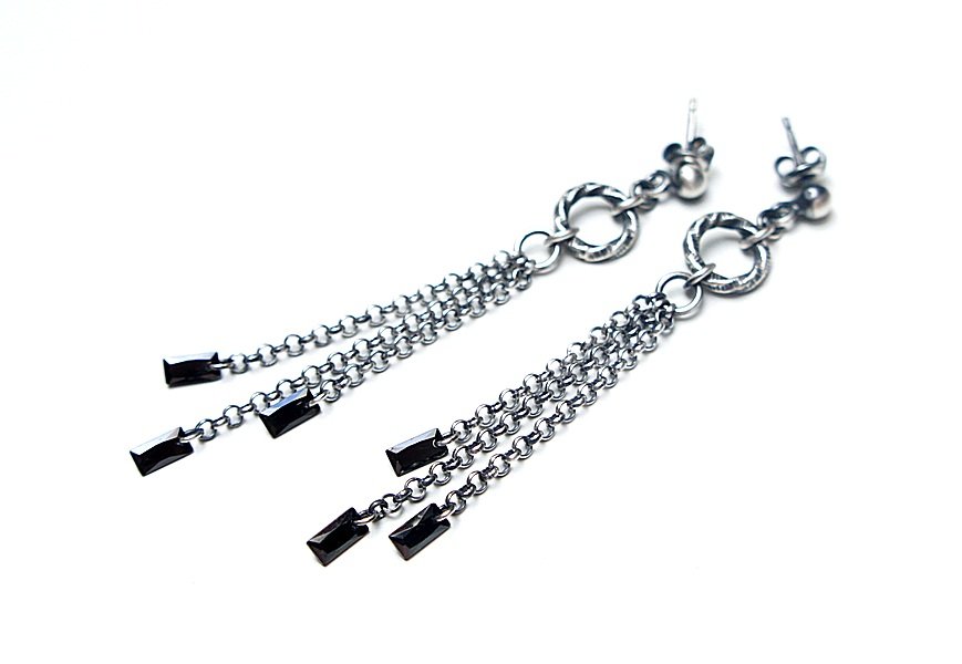 Kolczyki wykonane ze srebra [pr. 925] oraz szlifowanych cyrkonii w kształcie bagietek. Srebro oksydowane i przetarte. Całkowita długość kolczyków 7,2cm. Biżuteria ozdobnie zapakowana.