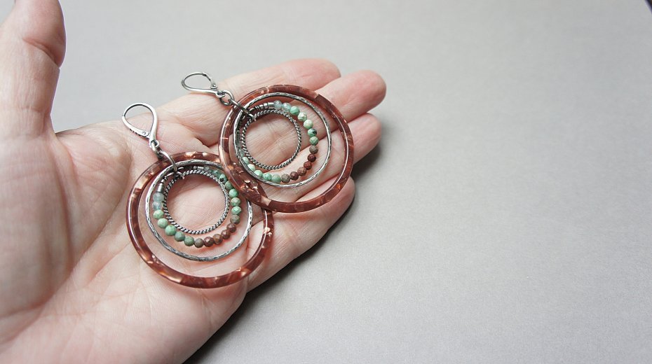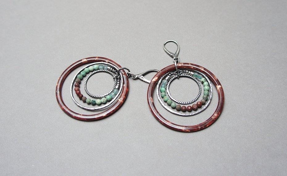Kolczyki wykonane ze srebra [pr. 925 i 930] w połączeniu z dużymi kołami z żywicy [48mm],fasetowanymi kuleczkami naturalnych turkusów [3mm] . Srebrne koła kute [ śr. 35mm i 21mm] . Srebro oksydowane i przetarte. Całkowita długość kolczyków 7,3 cm. Biżuteria ozdobnie zapakowana