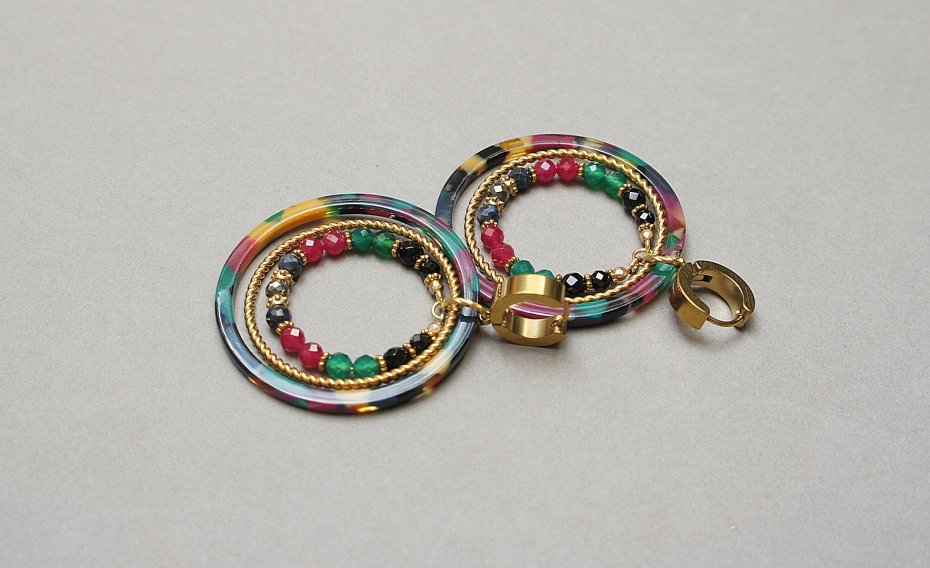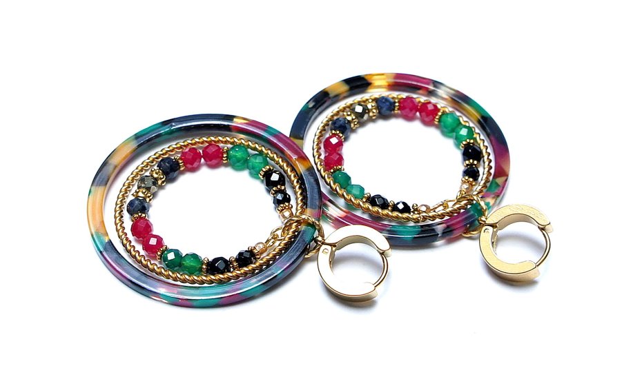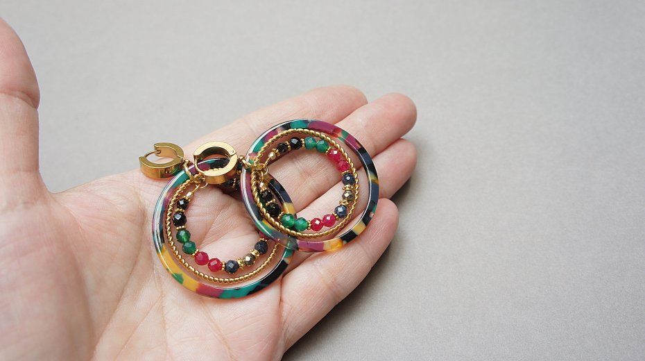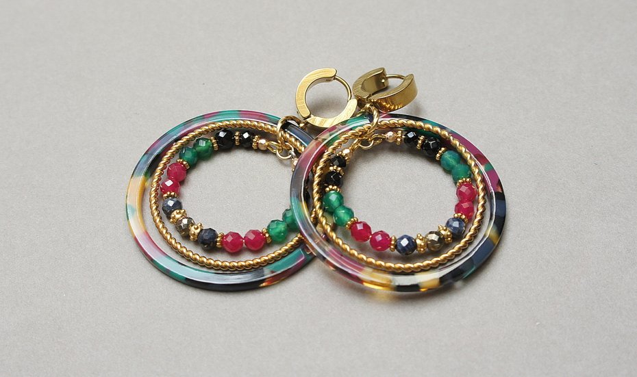 Kolczyki wykonane ze stali szlachetnej pokrytej zlotem oraz naturalnych minerałów:onyks [3mm i 4mm], zielony onyks [4mm], szafiry [4mm], jadeity [4mm], piryty [4mm], dużych obręczy z żywicy. Średnica kół 44mm oraz 28mm. Całkowita długość kolczyków 6,2cm. Biżuteria ozdobnie zapakowana.