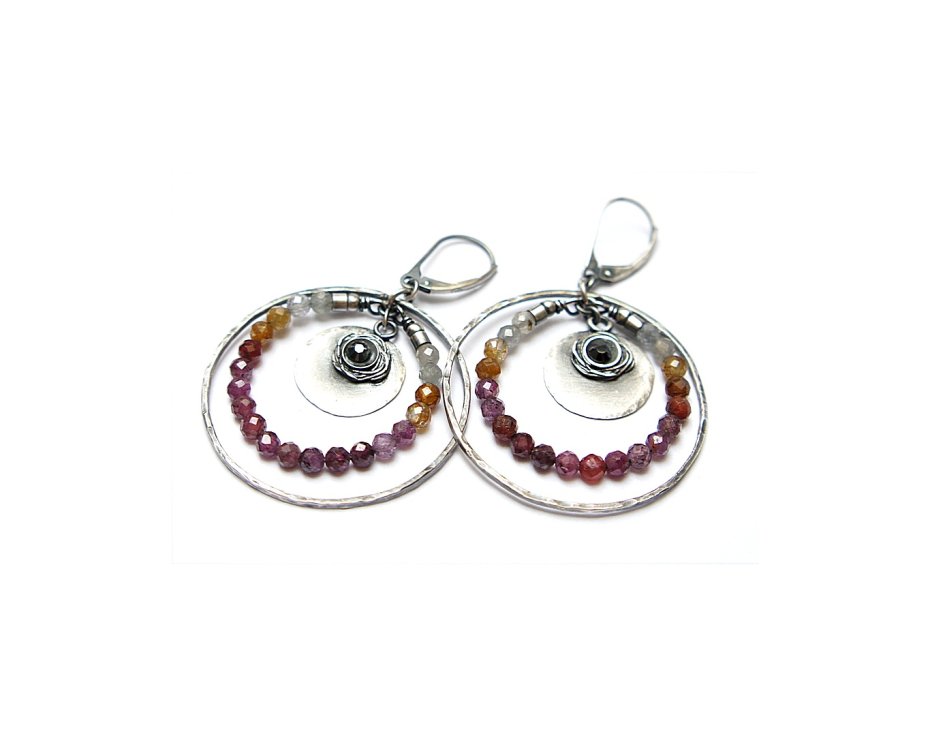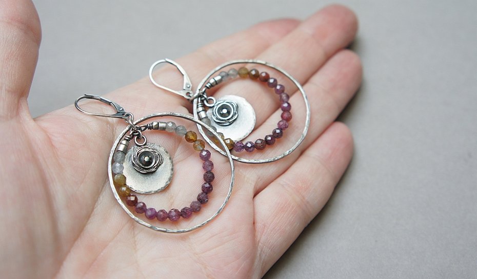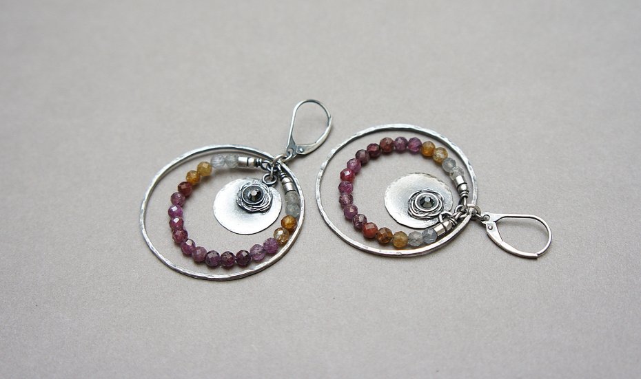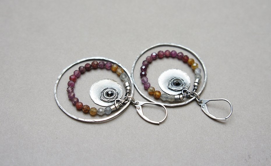 Kolczyki wykonane ze srebra [pr. 925 i 930] w połączeniu z d fasetowanymi kuleczkami naturalnych szafirów [3mm]. Srebrne koła kute [ śr. 35mm ]. Srebro oksydowane i przetarte. Całkowita długość kolczyków 5,5 cm. Biżuteria ozdobnie zapakowana