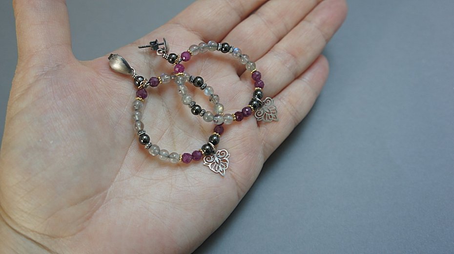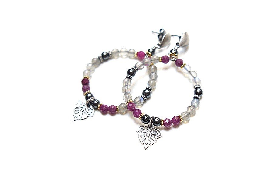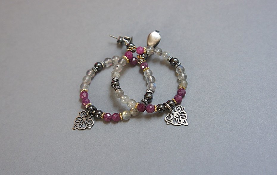 Kolczyki wykonane ze srebra i srebra pokrytego 24k złotem [pr. 925] w połączeniu z wysokiej jakości kamieniami - labradoryty [4mm], fasetowane kuleczki rubinów [4mm], hematyty [4mm] oraz ażurowe zawieszki. Całkowita długość kolczyków: 6,5 cm. Średnica kół 3,5cm. Biżuteria ozdobnie zapakowana.NA PROŚBĘ KLIENTA MOŻEMY WYKONAĆ TEN MODEL W KAŻDEJ KOLORYSTYCE. W TEJ SPRAWIE PROSIMY O WCZEŚNIEJSZY Z NAMI KONTAKT.