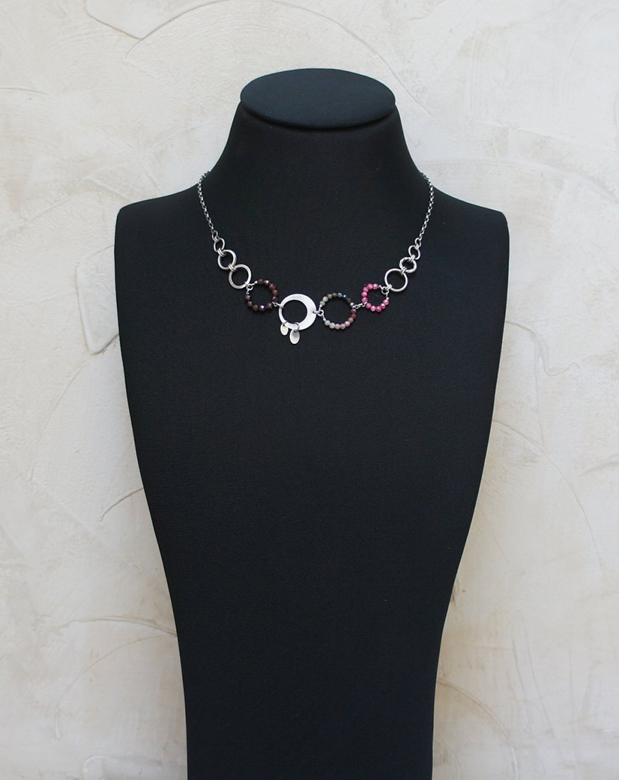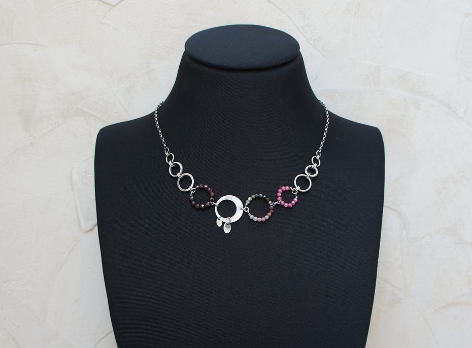 Naszyjnik wykonany ze srebra [pr. 925] w połączeniu z naturalnymi kamieniami: granaty fasetowane [4mm],turmaliny [3mm] ,cyrkonie [3mm] oraz srebrnymi ogniwami . Całość oksydowana i przetarta. Długość naszyjnika 45cm. Biżuteria ozdobnie zapakowana.