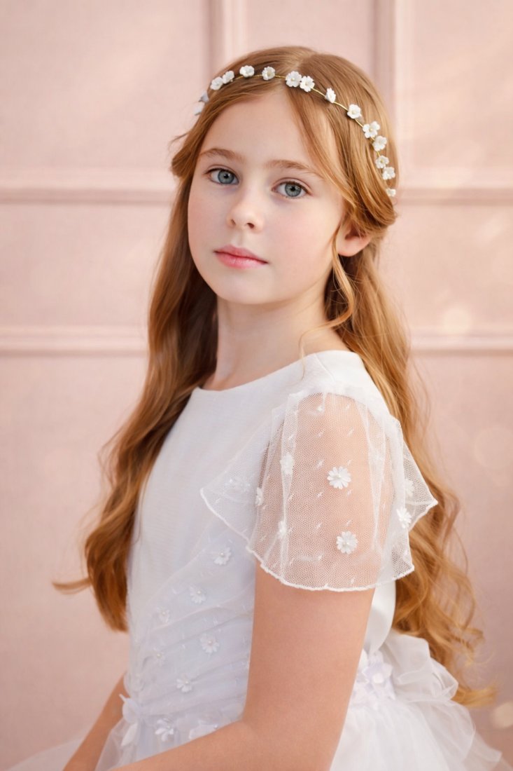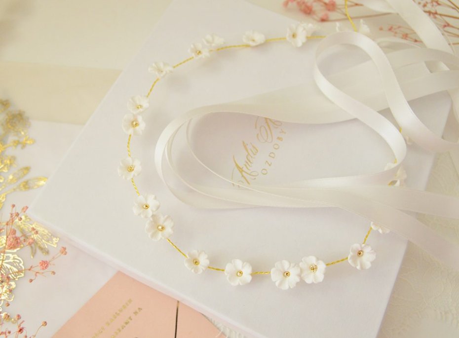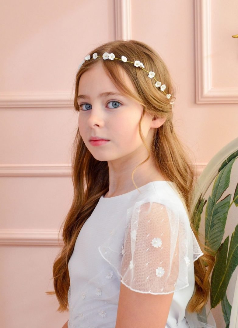 Wianuszek wyplatany z białych ręcznie formowanymi kwiatków w kolorze białym oraz złotych perełek w środku każdego kwiatka. Drucik wysokiej jakości w kolorze złotym, klasycznym. Wianuszek wiązany dwustronne białe tasiemki szerokości 1 cm, posiada pętelki do wpięcia wsuwkami. Może być założony tradycyjnie, a także jako dekoracja upięcia. Długość całkowita 50 cm. Niezwykle uroczy, pasujący do zarówno do sukienki jak i alby.