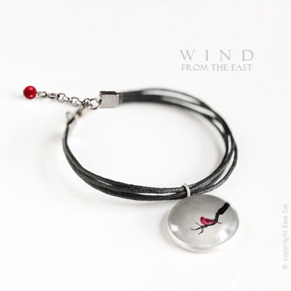 Urocza, prosta bransoletka w luźnym stylu. Miniaturka mojej grafiki wywołana na papierze fotograficznym - wydruk zachowuje wszystkie szczegóły a kolor jest wprost hipnotyzujący - głębi i sekretnego klimatu dodaje kopuła przeźroczystego szkiełka która zabezpiecza obrazek na długie lata. 4 bawełniane woskowane sznureczki w harmonizującym kolorze - baza i zapięcie w kolorze starego srebra długość bransoletki regulowana, (16-18 cm zapięcie - klasyczne karabinkowe. Średnica zawieszki 20 mm.