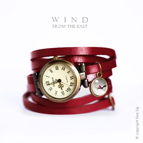 Oryginalna bransoletka - zegarek z kolekcji Wiatr ze Wschodu. Skórzany, ciemno czerwony rzemyk szeroki na 5 mm sześciokrotnie owija nadgarstek. Zapięcie umożliwia regulację szerokości. Wielkość tarczy zegarka 25 mm, średnica charmsa 12 mm. Zapięcie, charms i zegarek w kolorze antycznego złota.