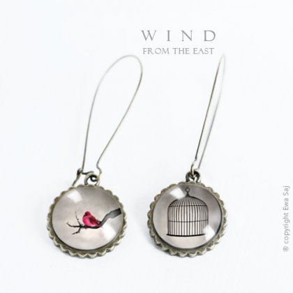 Oryginalne, zaczarowane, romantyczne kolczyki. Miniaturki moich grafik ukryte pod szklaną kopułą przeźroczystego szkiełka, umieszczone na stylowym medalionie w kolorze antycznego złota o średnicy 19 mm. Wielkość graficznej miniatury 16 mm. Długość kolczyków 5,5 cm