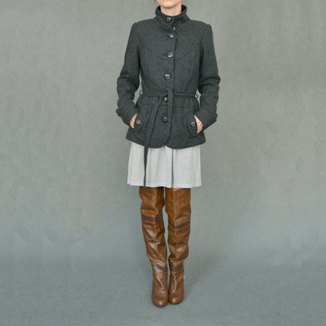 Płaszczyk w grafitowym kolorze marki VERO MODA. Zapinany na guziki, na stójce, którą można rozłożyć na kołnierz. Po bokach kieszonki. Wiązany w talii. Na podszewce. W połowie z wełny.
