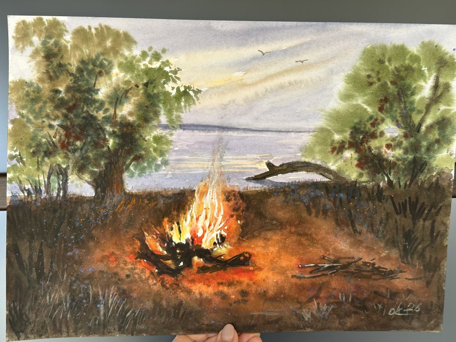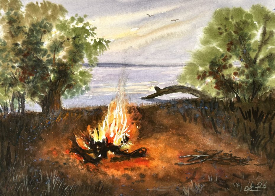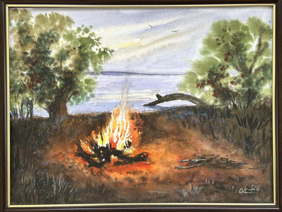 Tagi: #akwarelowy krajobraz, #ognisko, #rzeką, #wieczorne ognisko