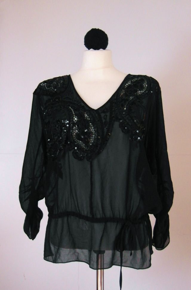 Czarna, przeźroczysta z wyszywanym cekinami dekoltem, w tym haft richelieu, góra pleców również ozdobiona haftem.Dół bluzki ściągany tasiemką tworząc delikatną falbankę.Rękawy z przeszytym przymarszczeniem wzdłuż. Dosyć głęboki dekolt.