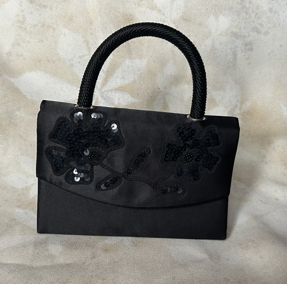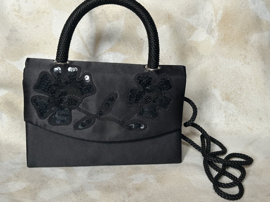 Wieczorowa torebka do ręki lub na sznurkowy pasek . Satyna i ozdobne cekiny .Zapinana na zatrzask Podstawa 18 x 7 wysokość całkowita z rączką 20 cm bez rączki około 12 cm . Ze sznurkowym paskiem około 65 cm . Bezpiecznie usztywniona . Wewnątrz kieszonka . Stan zachowania bardzo dobry