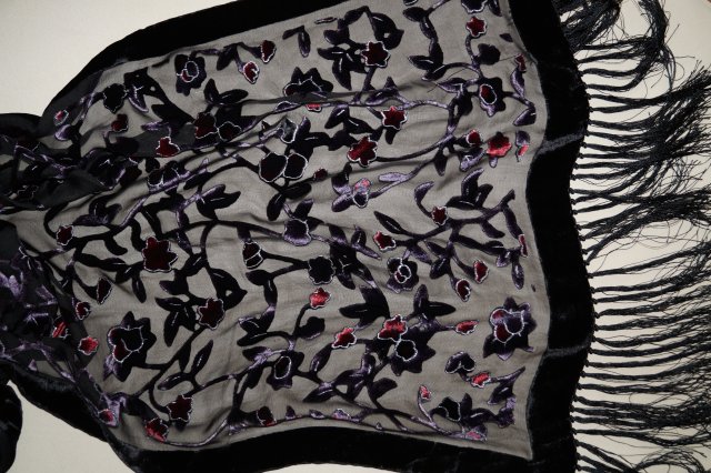 Fantastyczny elegancki szal 65 % -jedwab, 35%- wiskoza, półprzezroczysty, na delikatnej siateczce wzór roślinny o fakturze aksamitu w kolorach śliwkowym i bordo, dodatkowo ozdobione srebrną konturówką, brzeg zakończony subtelnymi frędzelkami, pięknie się układa, jest miękki i przyjemny w dotyku, nietuzinkowe wykończenie każdej wieczorowej kreacji:)