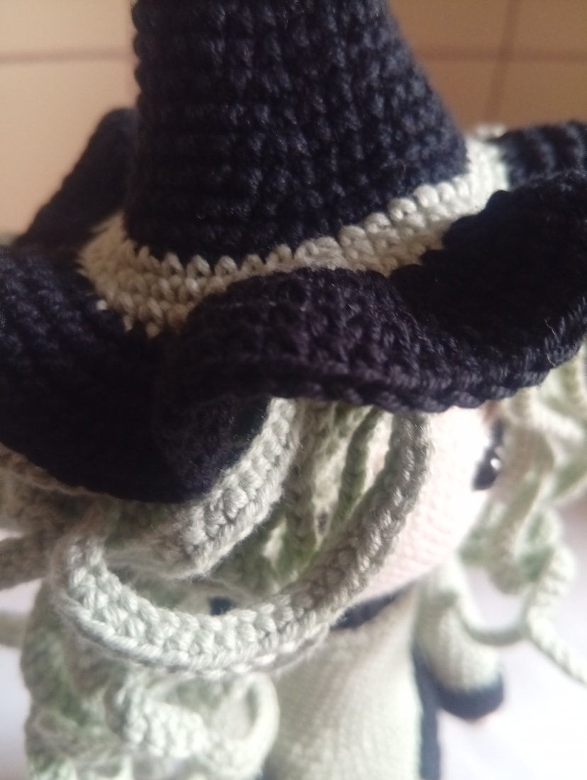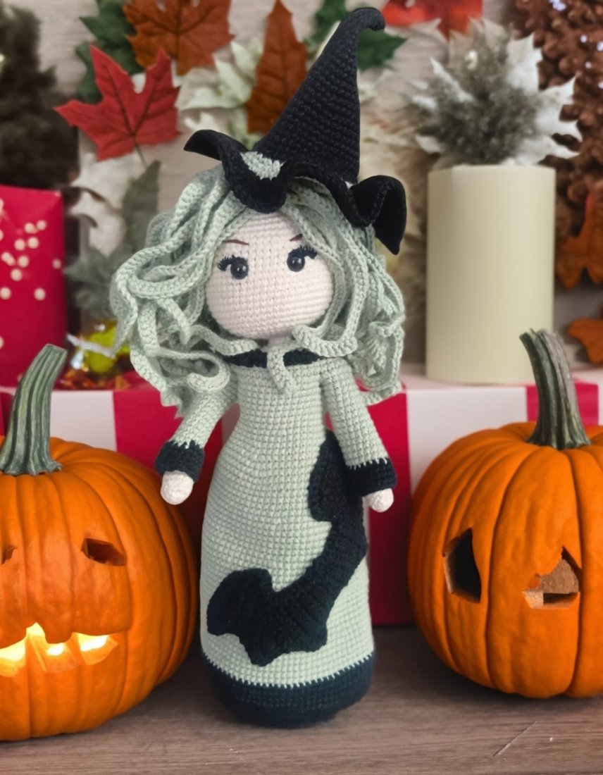 Ta urocza wiedźma została wykonana w całości ręcznie z miękkich, bawełnianych nici.