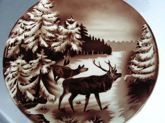 Ogromny Talerz ozdobny sygnowany VILLEROY & BOCH Made in Saar - Basin,sygnaturą stosowaną w latach 1874 - 1909 oraz numerem 2554 i bodaj D2. Mocna solidna to rzecz,z tyłu dziurka do powieszenia. Bardzo ciekawy w wyrazie i kolorystyce obrazek jeleniej rodziny zimowym zmierzchem .Zniuansowanie ciepłych,nasyconych brązów ma cieplej bieli Na błyszcząoo wykończony.
