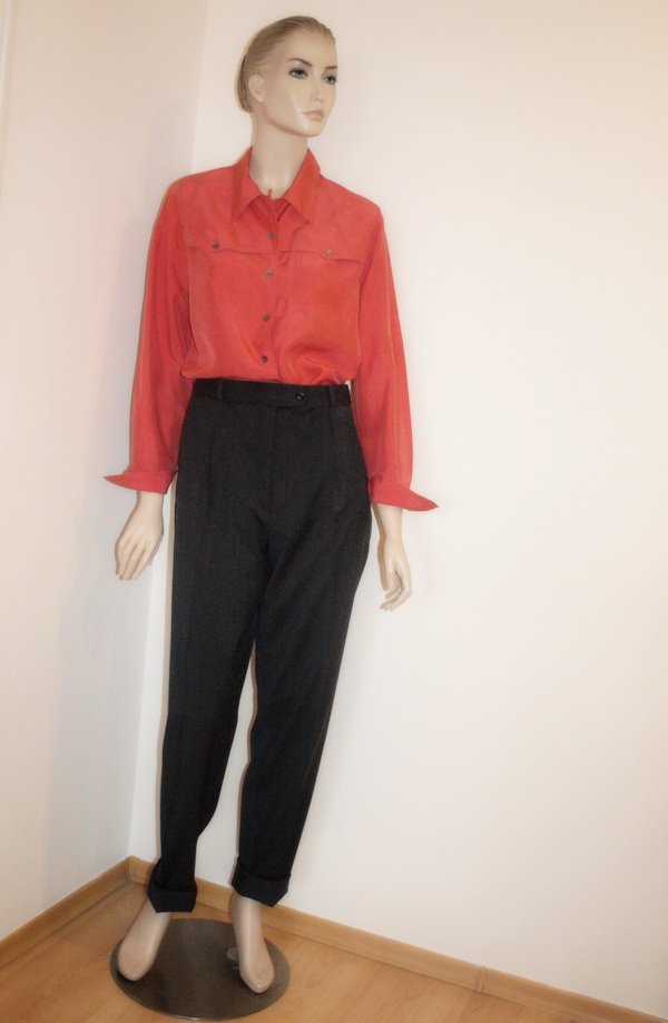 Eleganckie Włoskie spodnie ekskluzywnej marki, materiał 100% cienka, delikatna wełna. Stan bardzo dobry. Nogawka zwęża się do dołu. Góra z wyższym stanem i zakładkami. Rozmiar 44, i jest raczej rzeczywisty rozmiar. Podaję wymiary mierzone na płasko;