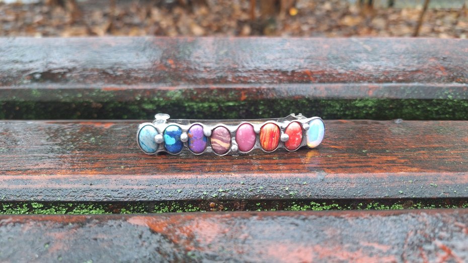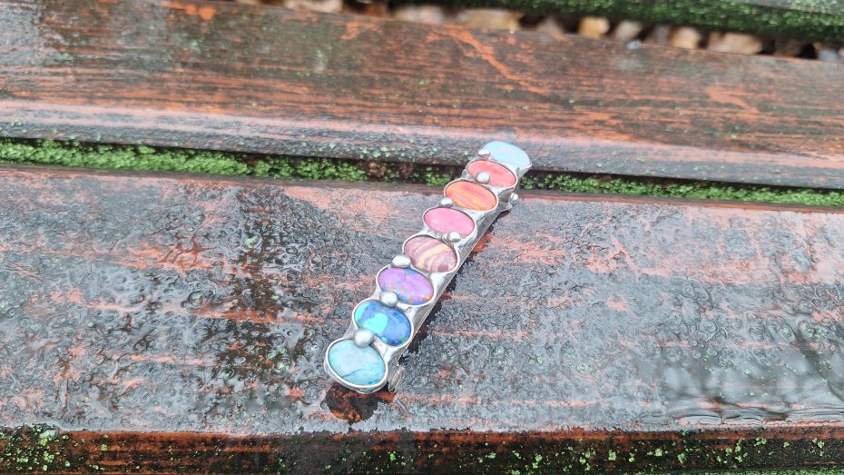 Klamra do włosów, wykonana z miedzi, cyny i szkła. Wymiary ok. 8 na 1.5 cm. Zapięcie 6 cm, metalowe.