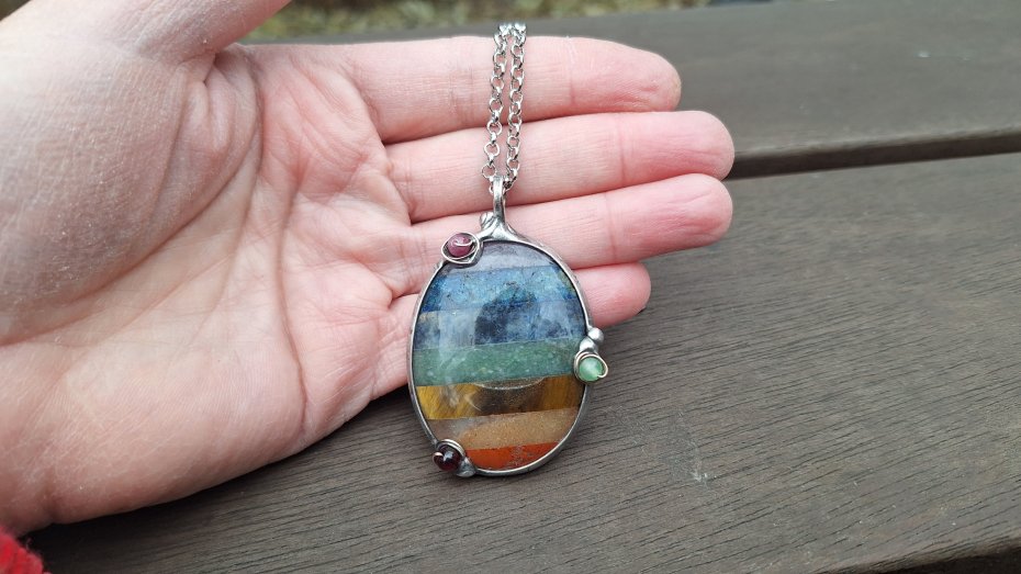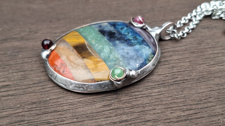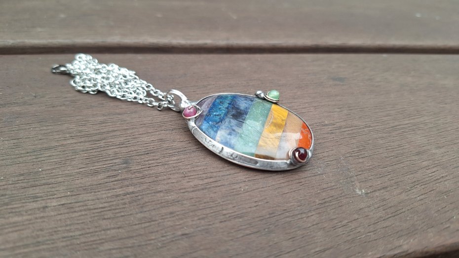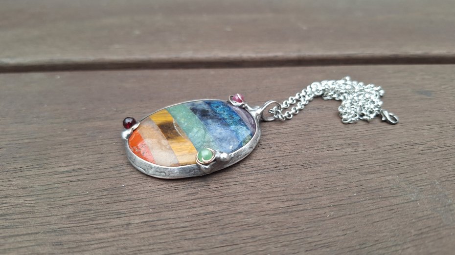 Kamienie: jaspis, kwarc, tygrysie oko, awenturyn, sodalit, lapis lazuli i ametyst.