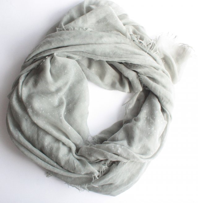 Duża chusta w subtelne wzory na tle zieleni przechodzącej lekko w popielaty. Odcień można określić też jako oliwkowy o zimnym odcieniu (bez nuty żółtej). Materiał to luźno tkana (prawdopodobnie) bawełna.