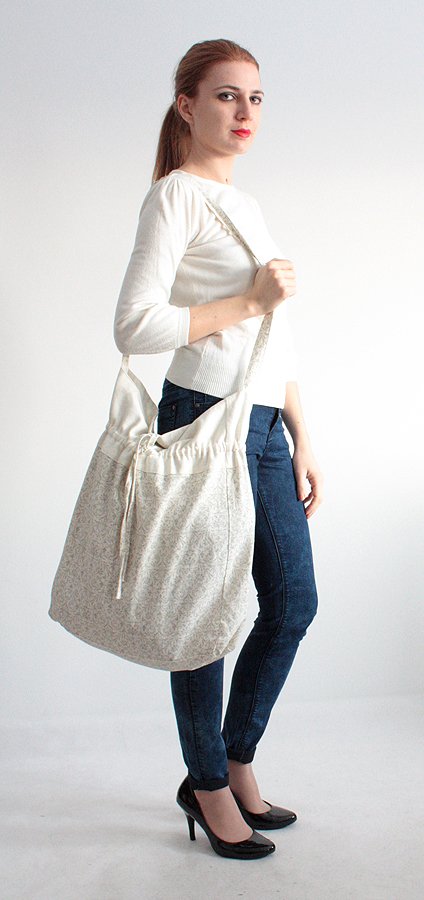 Wielka torba typu worek z naturalnej tkaniny. Jest bardzo pojemna, ściągana na górze.