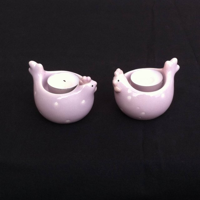 Para lekkich, ceramicznych świeczników na tea-lighty. Bardzo świąteczne, na błyszcząco szkliwione, poetycko lawendowe :) Fantastyczna ozdoba wielkanocnego stołu. 9 x 7 x 7 cm. Stan zachowania bardzo dobry.