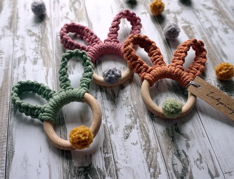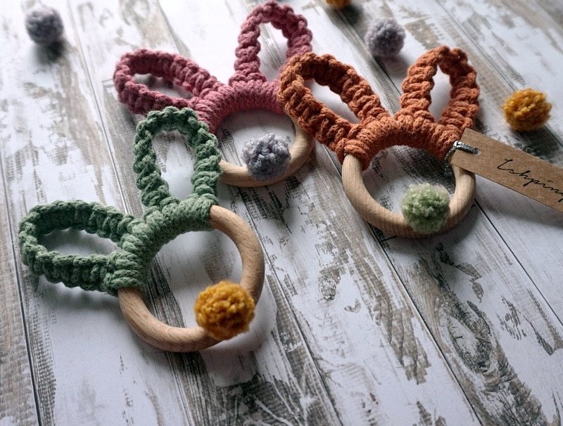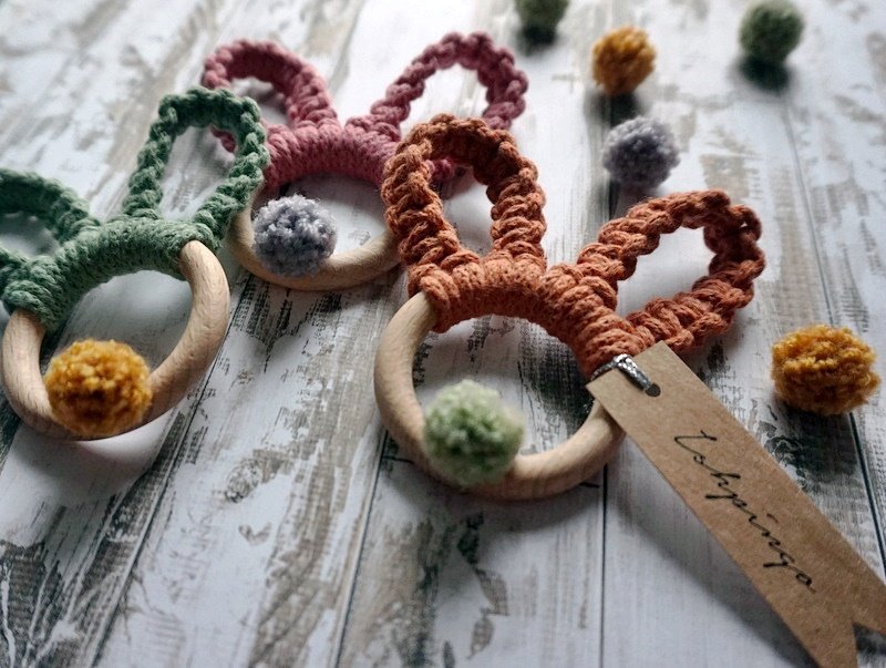 Zestaw składa się z 3 makramowych króliczych uszek (i puszystego ogonka) na drewnianych kółkach, w kolorach: terracota, kwiatowy i szałwia.