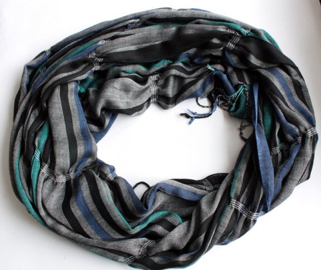 Szal o oryginalnej fakturze marki Long Island. Posiada poprzecznie wszyte gumeczki, które sprawiają, że szal układa się w ciekawy, lekko marszczony sposób.