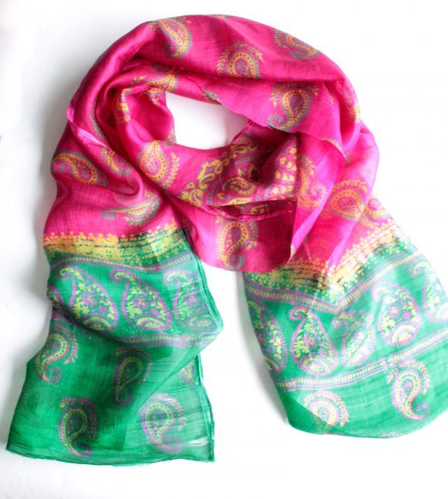 Długi, piękny szal w nasyconych odcieniach fuksji i zieleni. Materiał to prawdopodobnie jedwab.