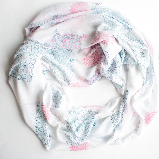 Wielki szal we piękne, niespotykane wzory na białym tle.