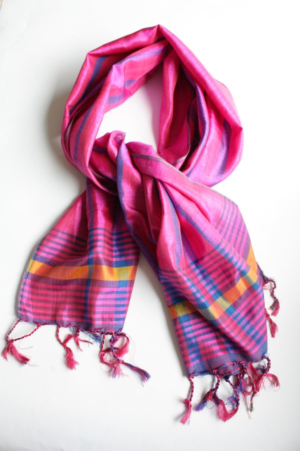 Wspaiały szal w mocnych kolorach. Materiał jest grubo tkany, oceniam go na jedwab.