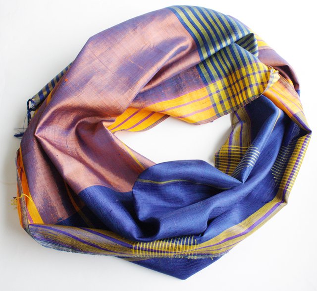 Wspaniały szal w mocnych kolorach. Materiał jest grubo tkany, oceniam go na jedwab (być może z domieszkami).