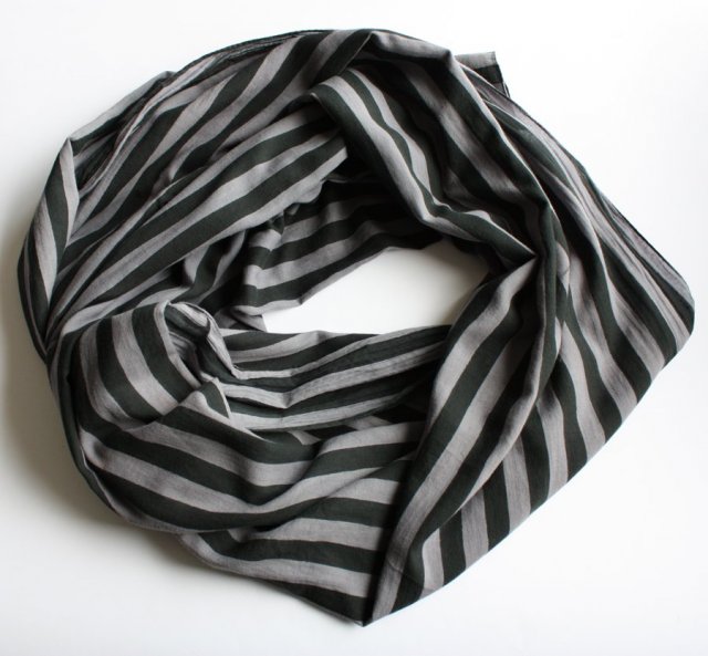 Wielki szal w szaro-czarne pasy, który będzie doskonałym uzupełnieniem stroju w wielu stylach. Świetnie sprawdzi się do klasycznego, czarnego płaszcza, ale też do rockowej skórzanej kurtki. Szal jest miękkim, miły w dotyku, w mojej ocenie jest wykonany z bawełny. Ze względu na jego wielkość można układać go i aranżować na wiele sposobów.