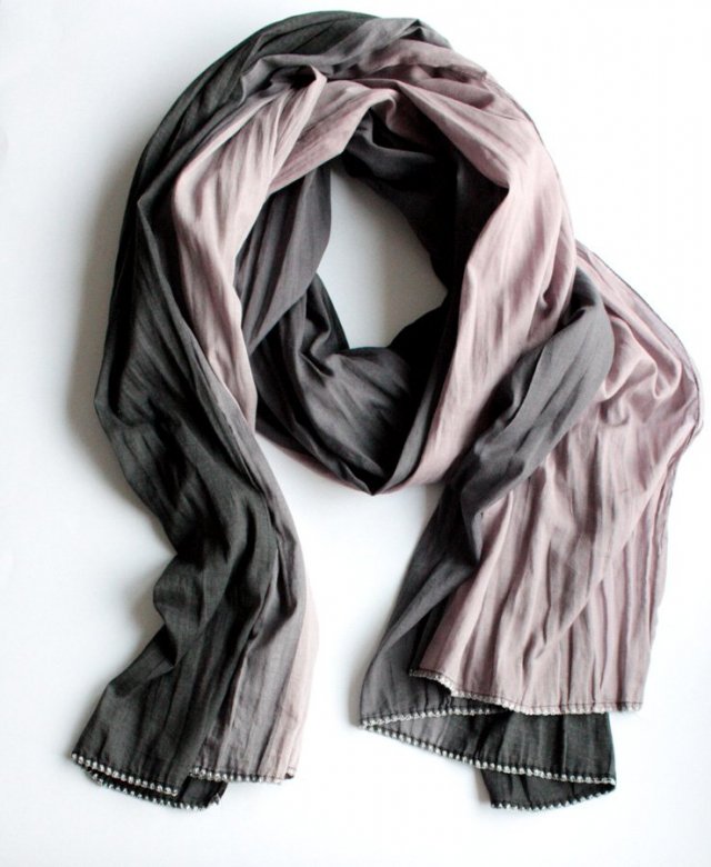 Wielki, miękki szal marki PIECES podzielony na trzy strefy kolorystyczne. Subtelne wkończenie srebrną nitkną nadaje mu wyjątkowego charakteru. Materiał to prawdopodobnie bawełna lub wiskoza.