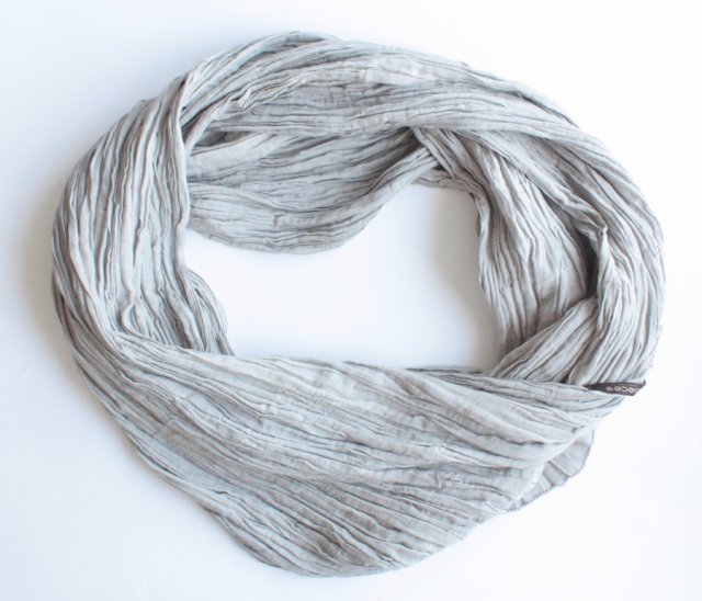Duży miękki szal w odcieniu stonowanej szarości, wykonany z tkaniny o ciekawej, marszczonej fakturze. Jest to prawdopodobnie bawełna lub wiskoza.