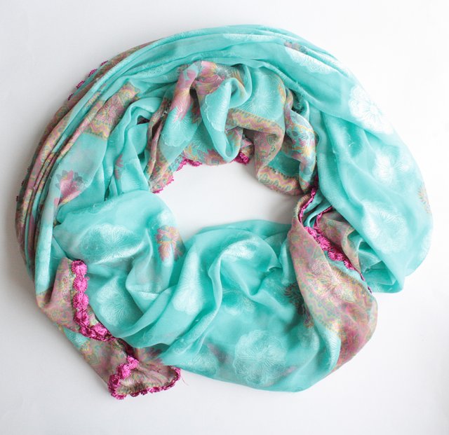 Wielki, zwiewny szal we wzory na niebieskim tle (równiez wytłaczane), z ciekawym wykończeniem brzegów.