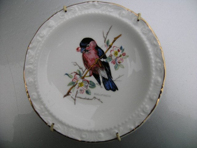 Wielkiej Urody Porcelanwy Talerzyk-Spodeczek. W pełni użytkowy,ale dokładamy profesjonalny uchwyt do powieszenia...może być fantastyczną ozdobą na ścianę. Sygnowany MAIFAIR Pottery Fine Bone China. Szlachetna biała porcelana na błyszcząco szkliwiona, kolorty żywe,miłe dla oka, złocenie na rancie. Wzór ciekawy,bo jakby malowany,a mikro kreseczki nieco jakby wystają spod szkliwa. Podpis BULLFINCH,co Gila oznacza :)