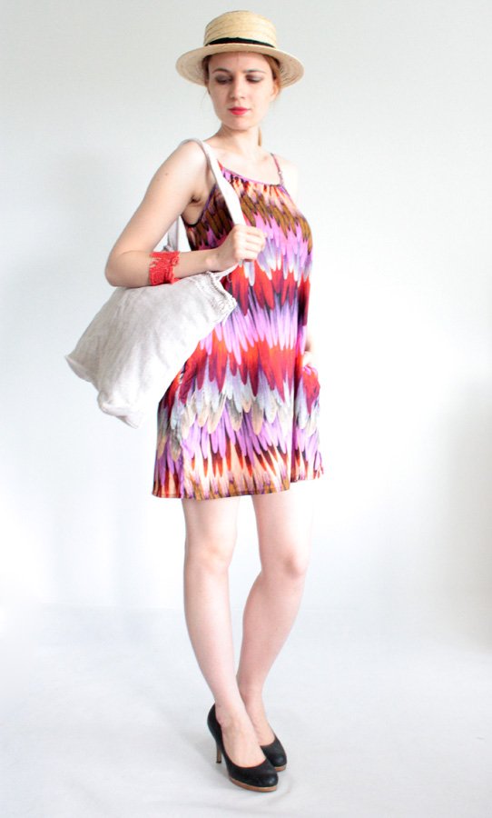 Urocza, bawełniana, wygodna sukienka z kieszeniami. Z przodu nad biustem wszyte gumki. Ramiączka regulowane.