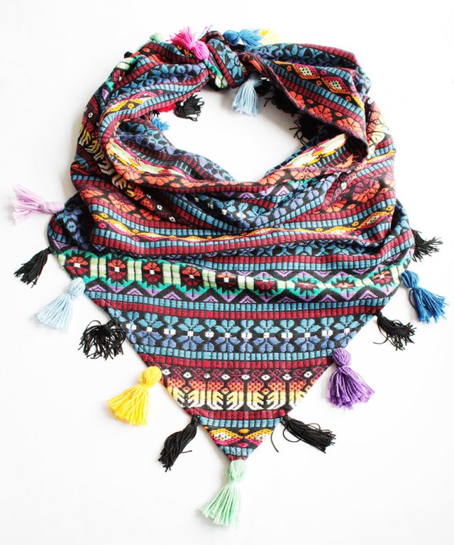 Wspaniała, wielobarwna, trójkątna chusta ozdobiona frędzlami. Wykonana prawdopodobnie z bawełny.