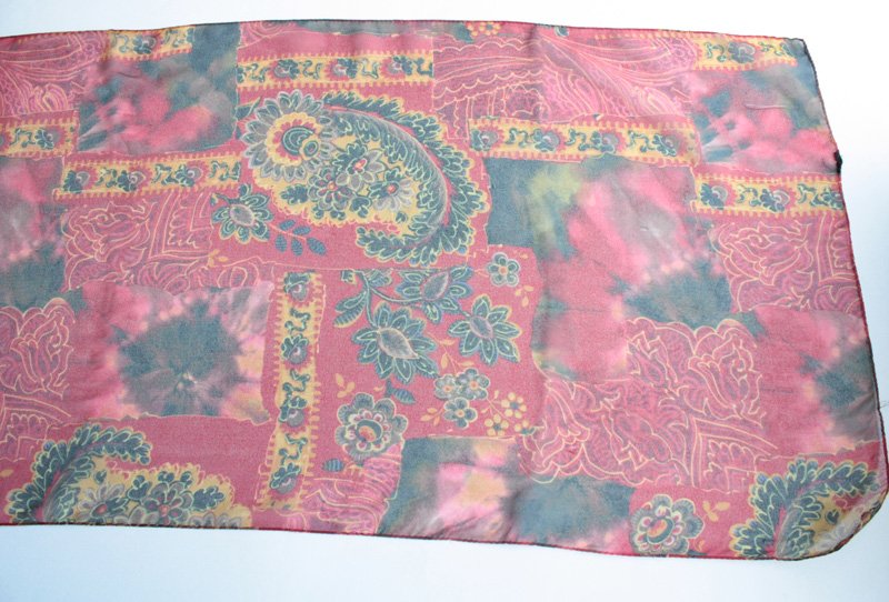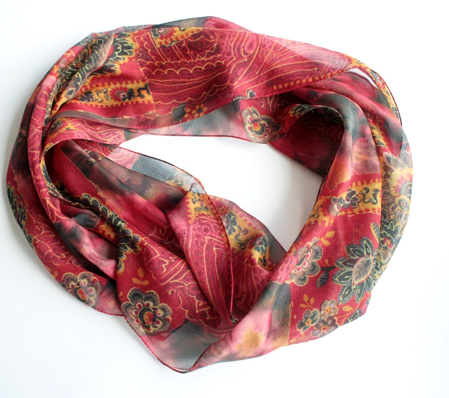 Zwiewny, kwiatowy szal w głębokich, nasyconych kolorach.
