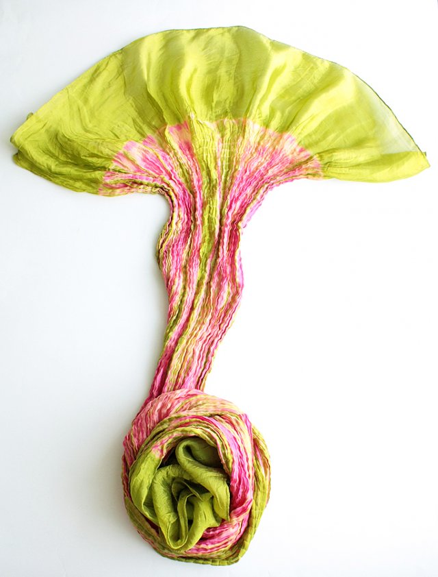 Absolutnie niezwykły szal o ciekawym fasonie. Szal jest marszczony, nieregularnie plisowany w centralnej części, zaś brzegi są rozszerzane niczym kielich kwiata. Kolory to limonkowa zieleń i róże odcienie różu.