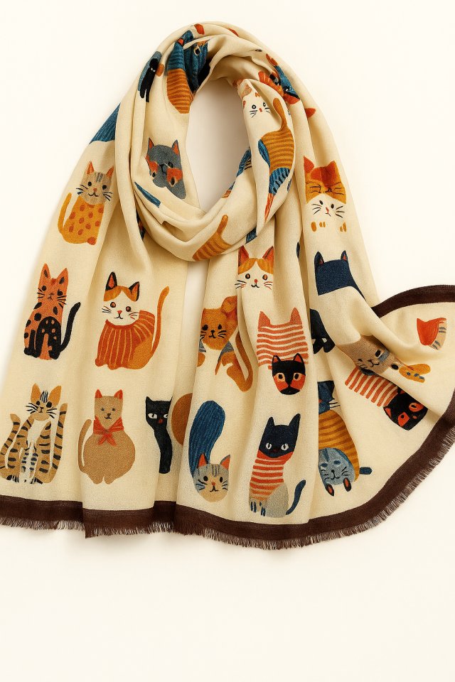 Słowa kluczowe SEO: szalik w koty, szal z nadrukiem kotów, prezent dla kociary, kocia moda, vintage szalik, ilustracje kotów, modny szal jesienny, miękki szal z kotami, szal handmade vibe, akcesoria dla miłośników kotów