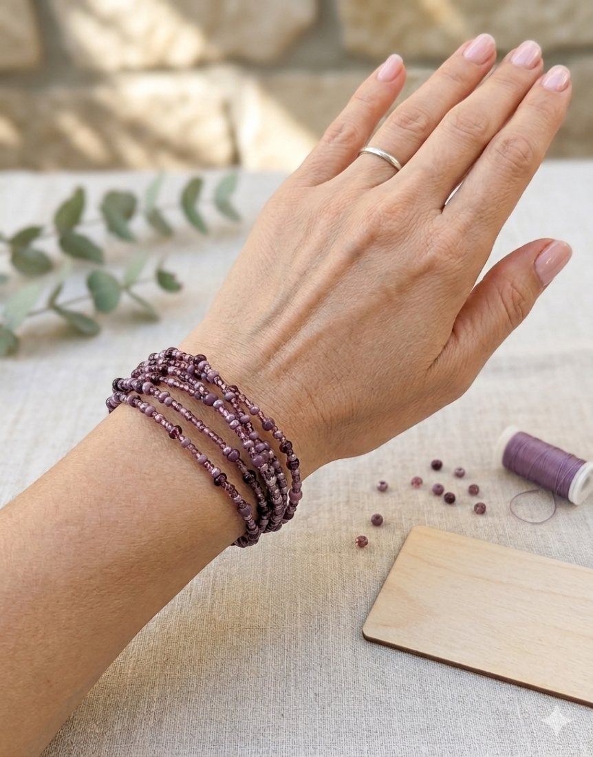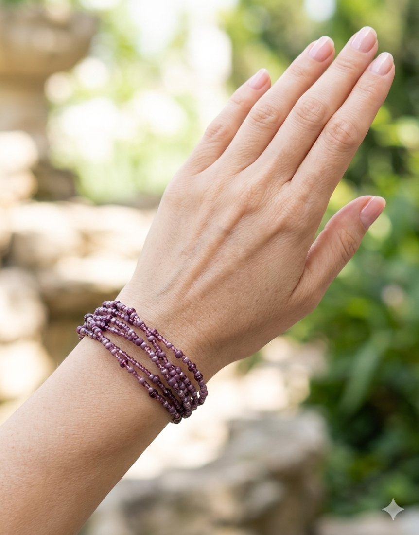 Dodaj swojemu nadgarstkowi odrobinę koloru i lekkości. Ta ręcznie wykonana bransoletka składa się z kilku rzędów drobnych szklanych koralików w różnych odcieniach głębokiego fioletu i ametystu. Jej elastyczna forma sprawia, że idealnie dopasowuje się do dłoni, stanowiąc doskonały dodatek zarówno do codziennych stylizacji, jak i na wieczorne wyjścia. To biżuteria dla kobiet ceniących minimalistyczny design z nutką boho. Dl. 17-19 cm