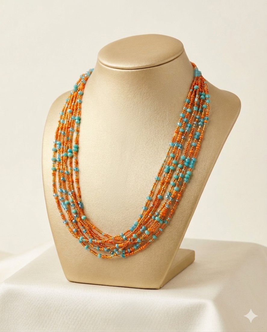 Dodaj swojej stylizacji energii dzięki temu wyjątkowemu, wielowarstwowemu naszyjnikowi. Połączenie drobnych, soczyście pomarańczowych koralików z akcentami w kolorze jasnego turkusu tworzy harmonijną, etniczną kompozycję. Lekka konstrukcja i kaskadowy układ sprawiają, że naszyjnik pięknie układa się na dekolcie, stanowiąc idealny dodatek zarówno do zwiewnych sukienek, jak i klasycznych, białych koszul. Zapiecie makrama ze sznurka z regulacją, wygodne do zakladania.