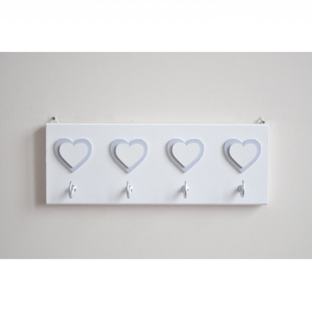 Wieszaczek został wykonany z drewna i pomalowany na biało. Ozdobiony jest podwójnymi serduszkami wyciętymi z drewnianej sklejki - na szare naklejone są mniejsze białe.