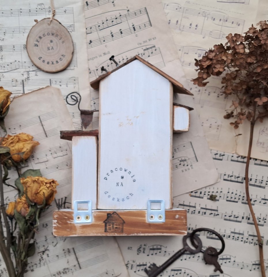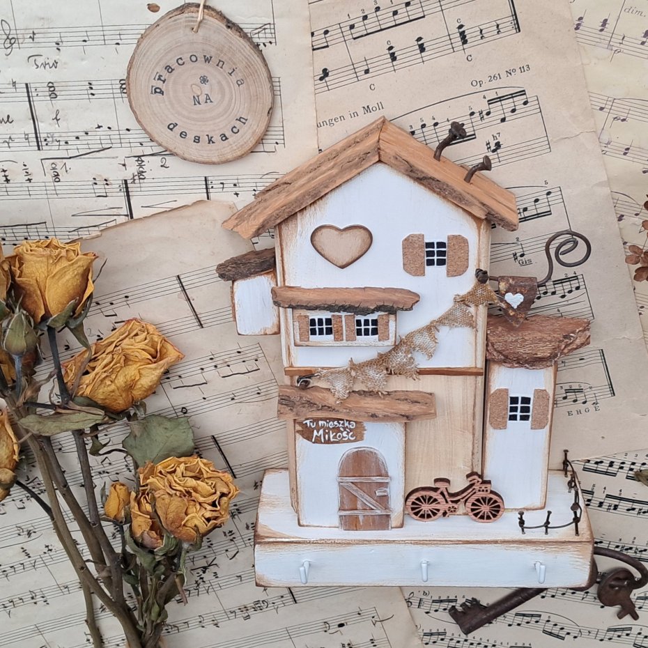 Dla wszystkich wielbicieli drewna i naturalnych dekoracji proponuję rustykany trójwymiarowy wieszak z domkami.